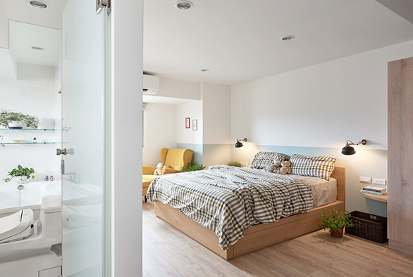 進入私人空間,臥室保持驚人的簡單,只需一張床和舒適的家具閱覽椅。