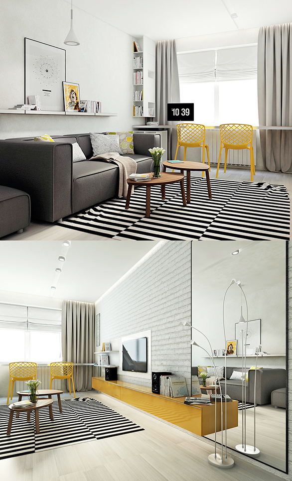 這是另一種使用時尚亮黃色的方式,給這個客廳一個mod感覺。