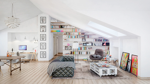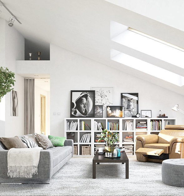 如果您住在傾斜的天花板上,可以將定制的書櫃直接安置在屋簷下,這是一個很好的選擇。策略放置的檯燈創造出各種閱讀點。