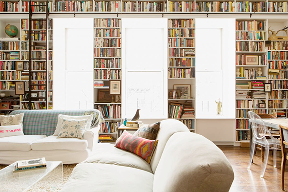 許多人可能會認為,他們在一個大型家庭圖書館的客廳裡根本沒有空間,但嘗試考慮每一個可用的空間。垂直看,不要忘記像窗口之間的狹窄差距,可以提供充足的書籍存儲空間。