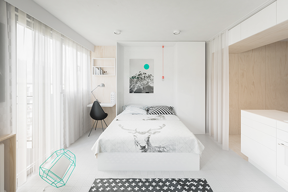 淺色和簡單的線條總是使房間看起來比實際更大。設計師使用單色縮放圖案編織俏皮的角色,而不會產生任何不必要的視覺雜亂。
